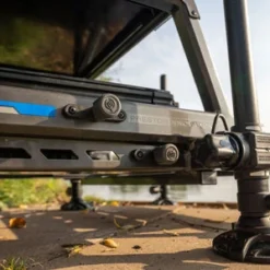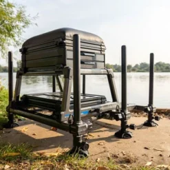 De cassette onder het frame bevat een 26mm bak en deksel waar indien nodig extra units aan toegevoegd kunnen worden. De box wordt geleverd met x6 telescopische poten voor moeiteloze fijnafstellingen aan de oever.